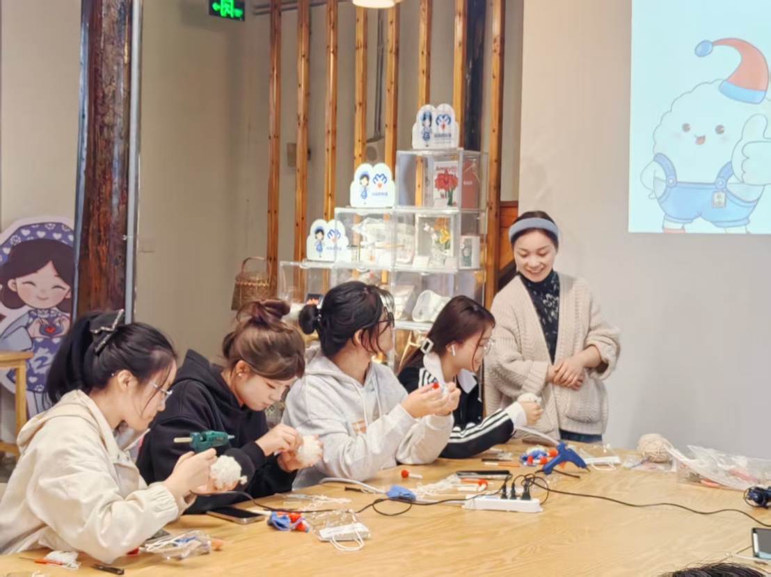 活动中,仰山社区“守艺人”共富工坊手艺人王芳现场教学,将当地名菜“宴球”化为萌趣“宴球宝宝”,以“一天最多做2个”的匠心诠释非遗坚守。学子们沉浸式学习“圈钩+短针”技法,组装玩偶时解锁成就感,更在创作中聆听“宴球”文化故事,实现从“校园学习者”到“地方文化感知者”的转变。