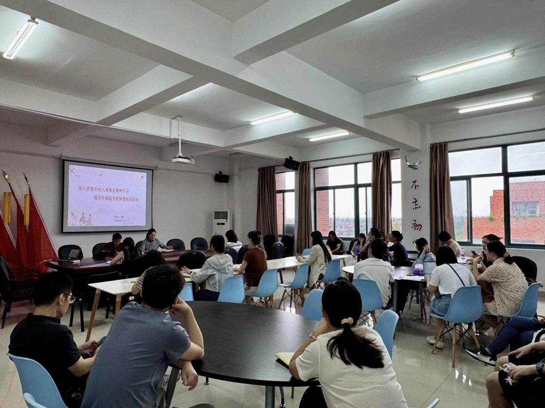 6月14日,外国语学院党总支在7号教学楼520会议室组织召开“深入贯彻中央八项规定精神学习教育 筑牢外国语学院师德师风防线”专题党课,学院全体教职工参加会议。学院党总支委员冯芳主讲。