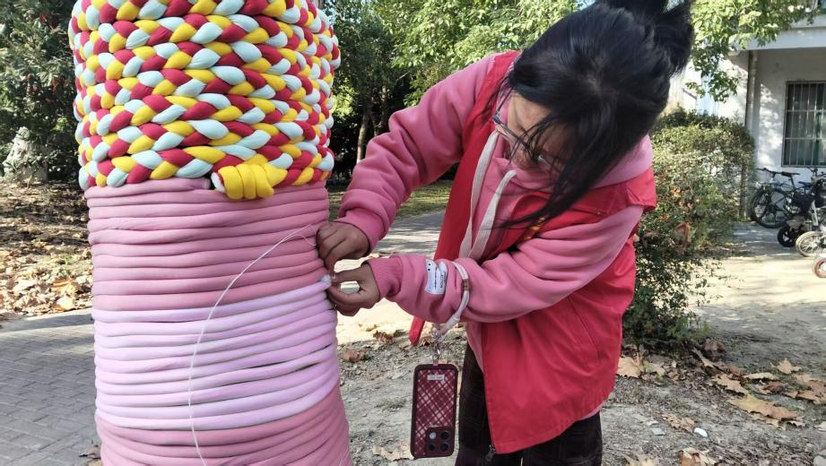 穿针引线、缠绕固定、校准调整……同学们化身“匠心裁缝”,将保温棉精准贴合树干,用线绳复刻出创意纹路,遇到接口松动的情况,便用针线细密缝制或点涂胶水定型,确保防寒衣既保暖又不损伤树皮。指尖翻飞间,一件件量身定制的“暖冬防护衣”整齐亮相。
