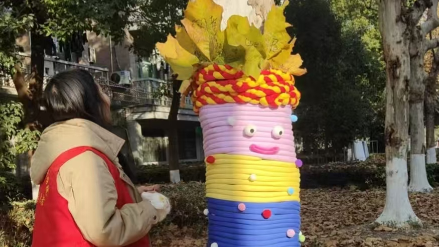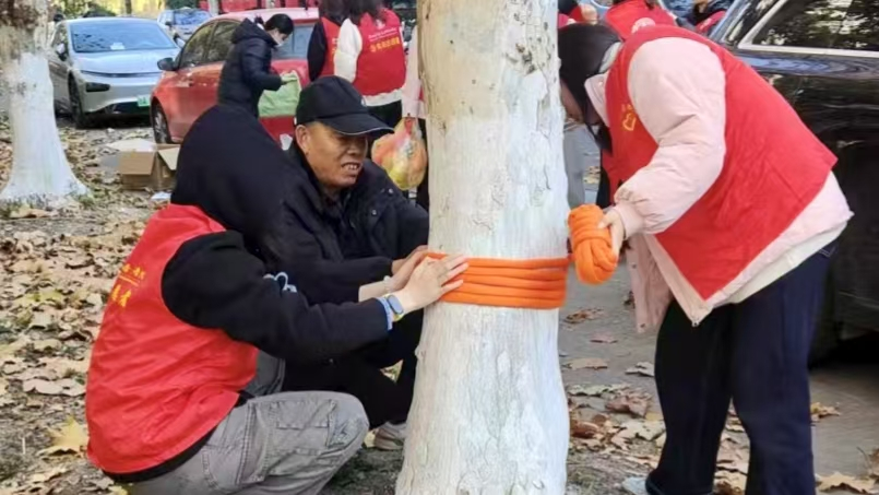 待所有树木“穿衣”完毕,同学们拿出提前收集的写有美好愿景的金黄梧桐叶,小心翼翼地将写有愿景的梧桐叶插在防寒衣的缝隙中,一片片金黄的“心愿叶”点缀在整齐的保温棉上,与冬日阳光相映成趣,既保留了自然本真,又为校园增添了温暖生机,让此次护树行动多了一份别样的仪式感。