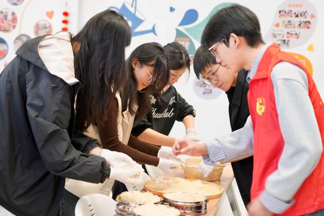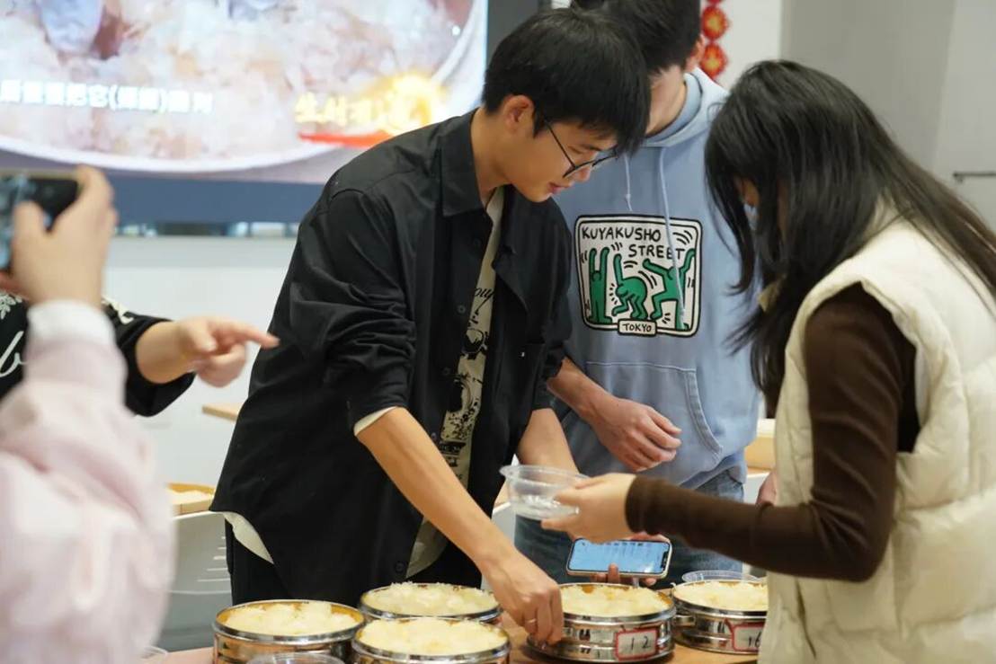 蒸煮间隙,学子们与当地群众一同漫步兴城村篾竹里周边,欣赏田园风光、感受人文景致,沉浸式体验“百样兴城”的乡村魅力。不久后,蒸好的宴球出锅,咬下一口,鲜嫩肉质与浓郁汤汁在舌尖绽放,大家不仅尝到了非遗美食的独特滋味,更品出了海宁地方文化的“回甘”。