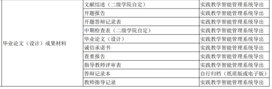 学生在完成毕业论文整套资料后,将导师认可的经过修改后的毕业论文成果材料上传到论文系统,保证系统里的是均是最终稿。论文答辩结束后,学生将亲笔签名的诚信承诺书拍照上传到系统。答辩记录本由答辩组组长评议后上传实践教学智能管理系统存档。