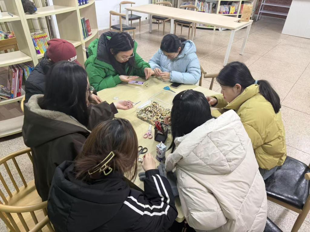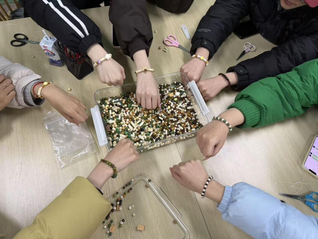活动开始后,现场氛围轻松而热烈。大家认真挑选着心仪的珠子,从色彩搭配到款式设计,从穿线打结到细节调整,每一步都充满专注与巧思。同学们相互交流心得、分享技巧,在动手实践中感受手工创作的乐趣,在欢声笑语中拉近彼此的距离。