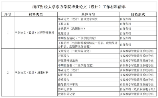 7.进一步完善毕业论文管理工作。2026届毕业论文(设计)工作在实践教学管理系统中完成,登录地址:浙江财经大学东方学院—信息门户—应用系统—实践教学管理系统,系统具体操作方法可在教务管理部网站“综合服务—学生服务”栏查阅《实践教学管理系统使用手册》。各二级学院可根据实际需要编制毕业论文工作手册(包括相关规章制度、写作要求、选题库、写作模板等)。